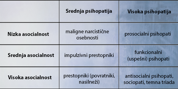 1. nizko funkcionalna psihopatska struktura: antisocialni psihopati, sociopati, temna triada,