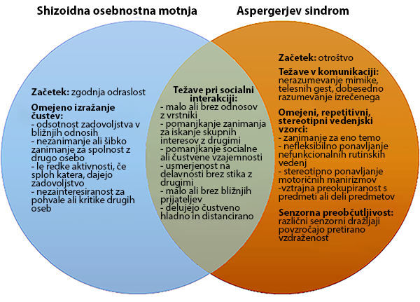 Nemara je še najtežje razlikovati med shizoidno osebnostno motnjo in motnjami iz avtističnega spektra, zlasti Aspergerjevim sindromom. Motnji sta si podobni po omejenem čustvovanju, pomanjkanju zmogljivosti za čustveno doživljanje in izražanje, le da sta socialna prizadetost in stereotipno vedenje/interesi pri osebah s shizoidno motnjo osebnosti manj opazni.